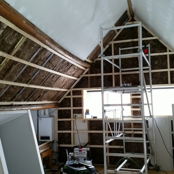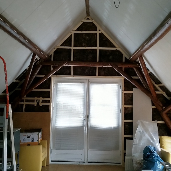 De gehele zolder is bekleed met dampdoorlatende folie en daarna geïsoleerd met minerale wol.