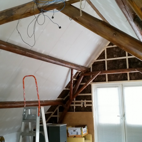 Deze "koude" zolder van 85 m2 die voorzien was van riet tegen de kap en een verlaagd plafond. Deze hebben we volledig gestript.