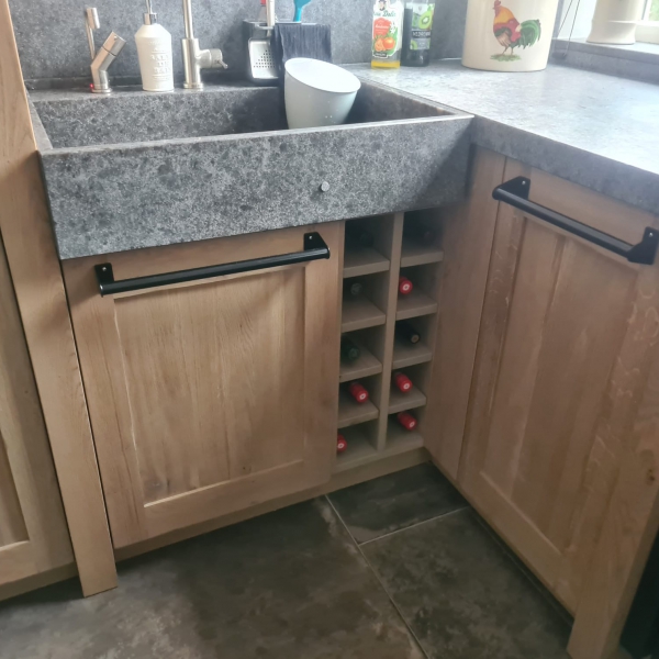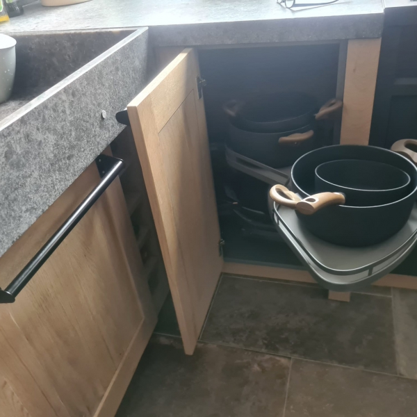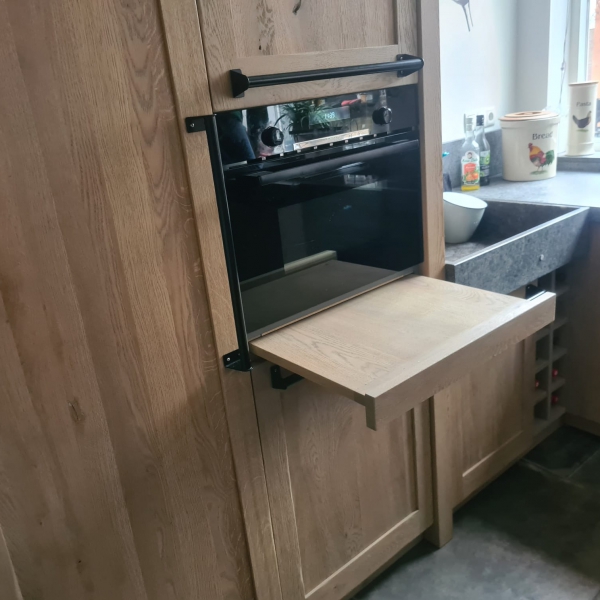 Deze massief eiken maatkeuken is voorzien van Blumotion softclose scharnieren en lades in antraciet kleur.