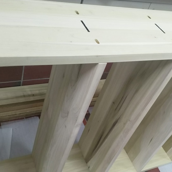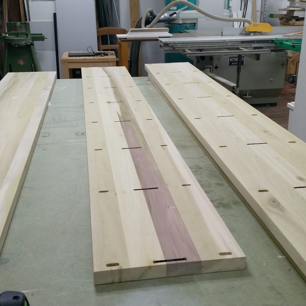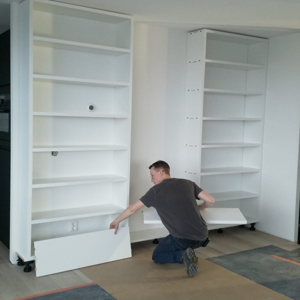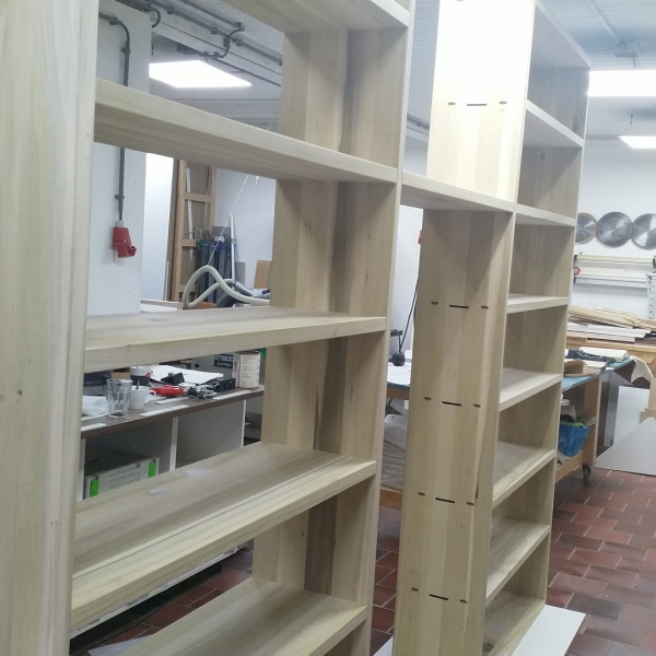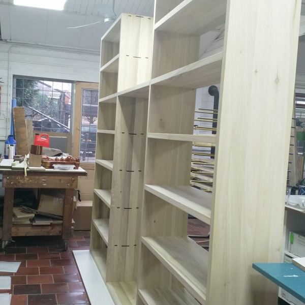 Deze massief Yellow Poplar maatwerk boekenkast is gemaakt om te passen tussen muur en open ruimte voor maximale ruimte winst. De kast is volledig demontabel gemaakt met het Lamello Clamex systeem voor een strakke, sterke, schroefloze verbinding.