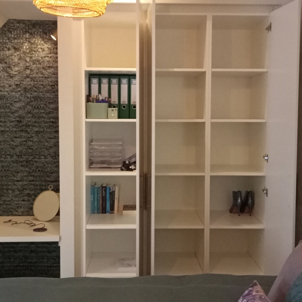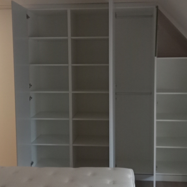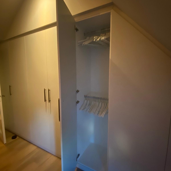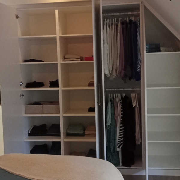 Wij hebben de schuinte van de kamer benut om zoveel mogelijk kastruimte te creƫren.