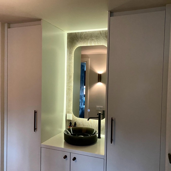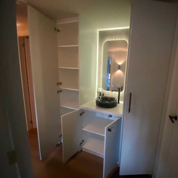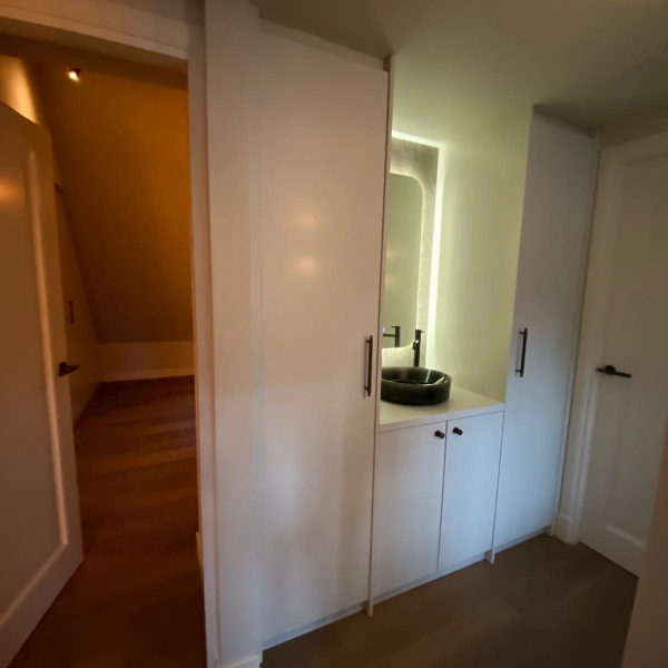 Op de overloop is een badkamermeubel gerealiseerd met maximale kastruimte.