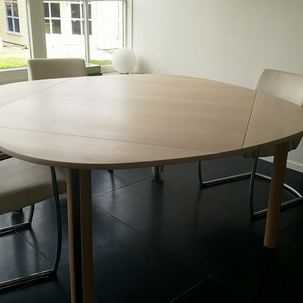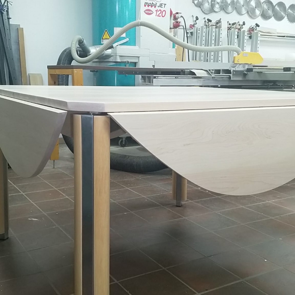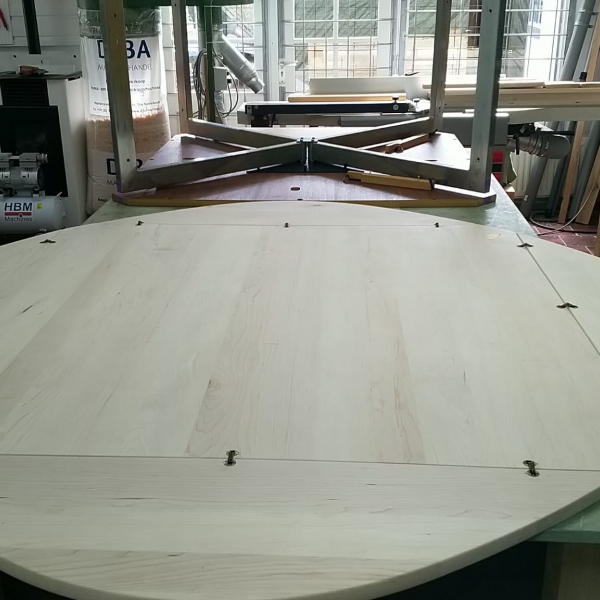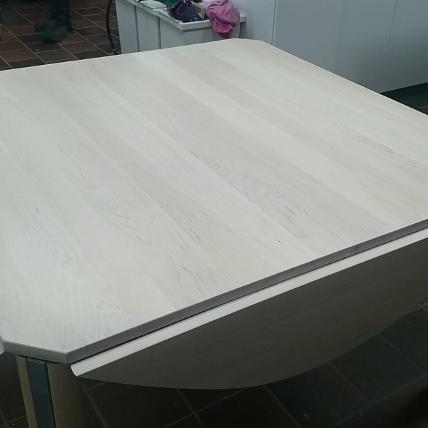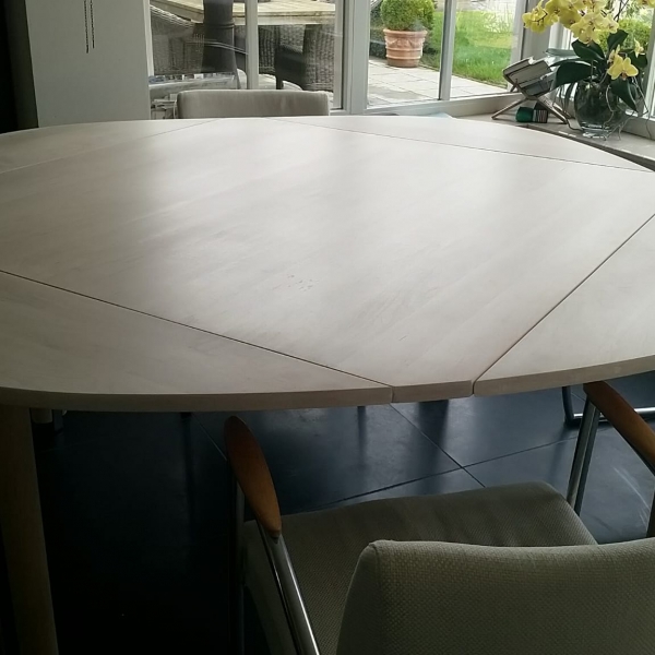 De klant had een esdoorn gefineerd hangoor tafelblad, die hij zelf heeft opgeknapt .Na verloop van tijd kreeg de tafel weer dezelfde kwalen. Daarna heeft de klant ons om professioneel advies gevraagd. Na een telefoongesprek zijn we samen tot een plan gekomen: een nieuw massief blad.
