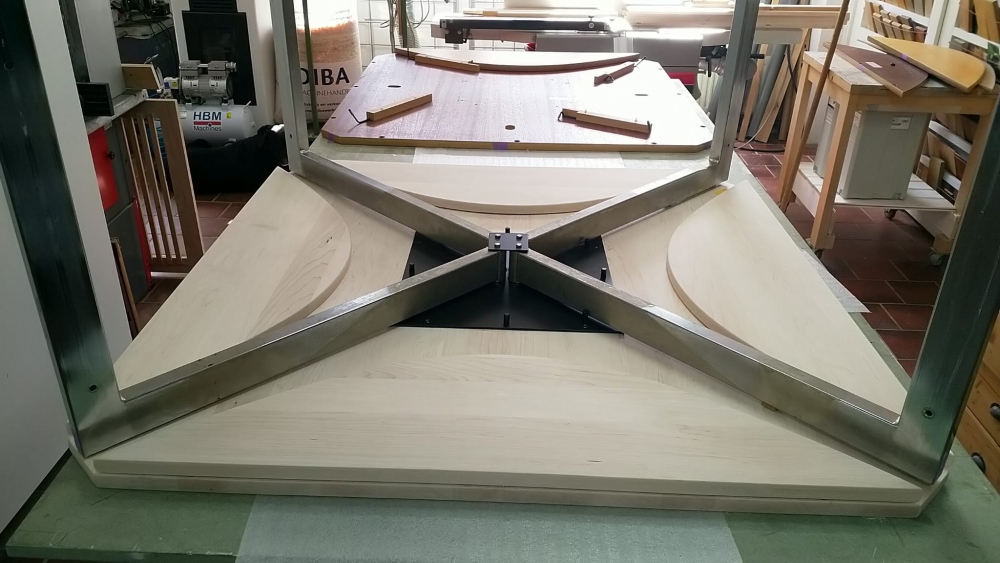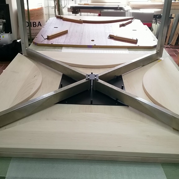 Het nieuwe tafelblad is uitgevoerd in massief Amerikaans esdoorn, volledig nagemaakt in vorm van origineel en op het bestaande onderstel teruggeplaatst.