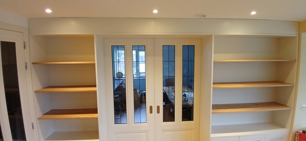 Massief eiken boekenplanken behandeld met Mist 5% van Rubio Monocoat.