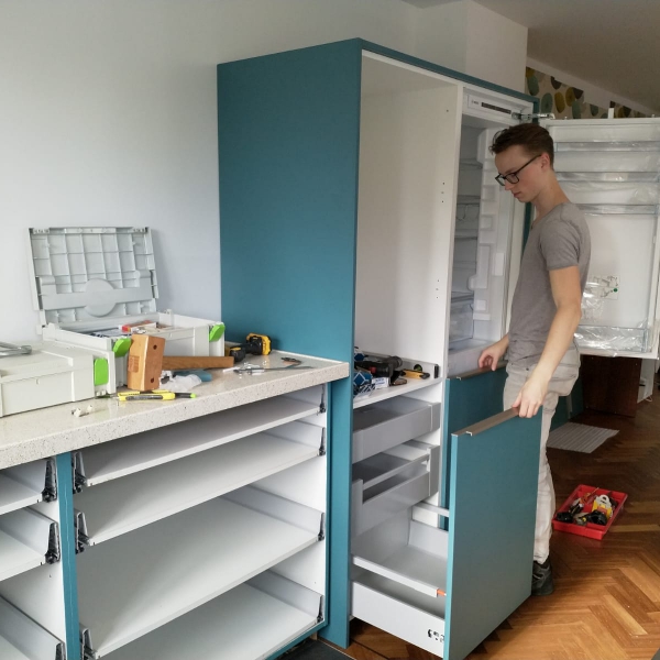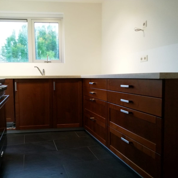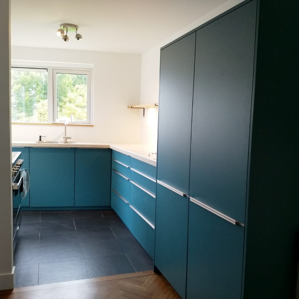 We hebben de oude deuren en fronten verwijderd en opnieuw gemaakt in niagara groen met greep lijsten.