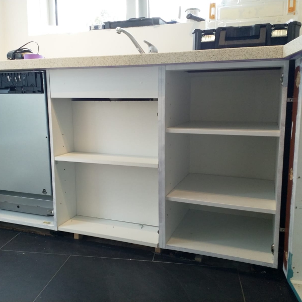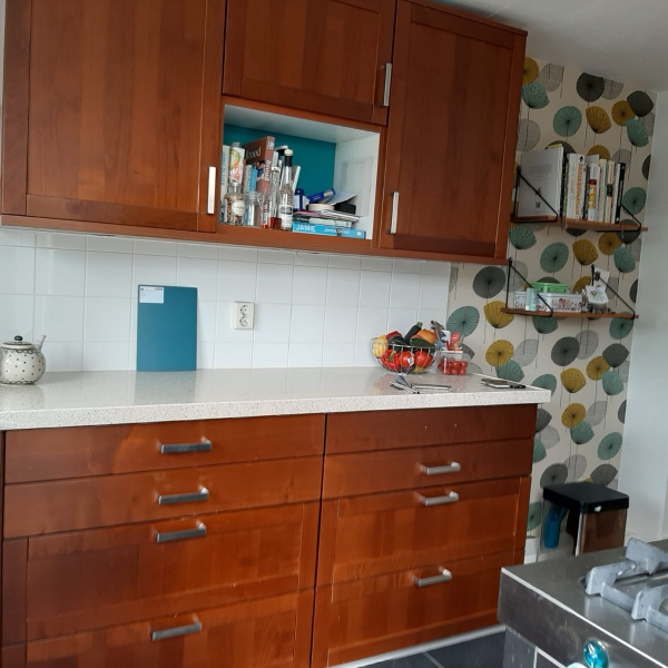 Er is een dubbele kast bijgemaakt voor een koelkast en levensmiddelen.
