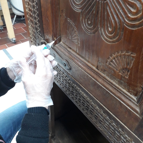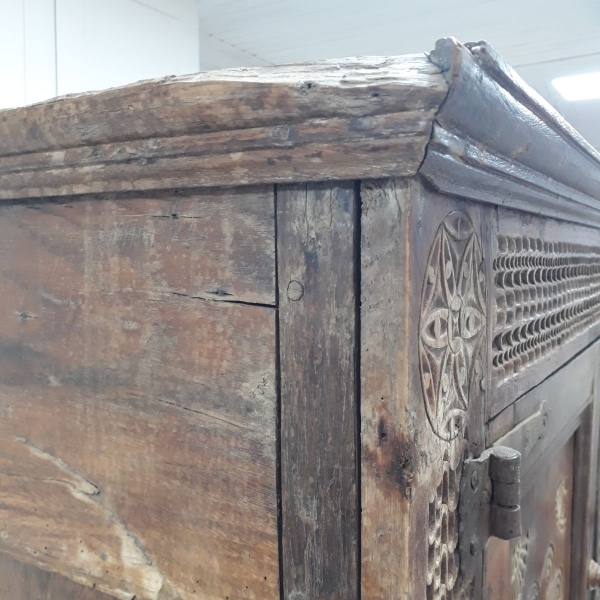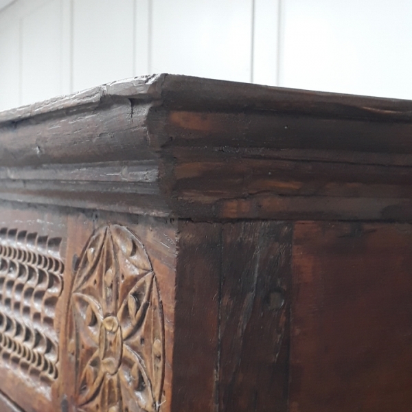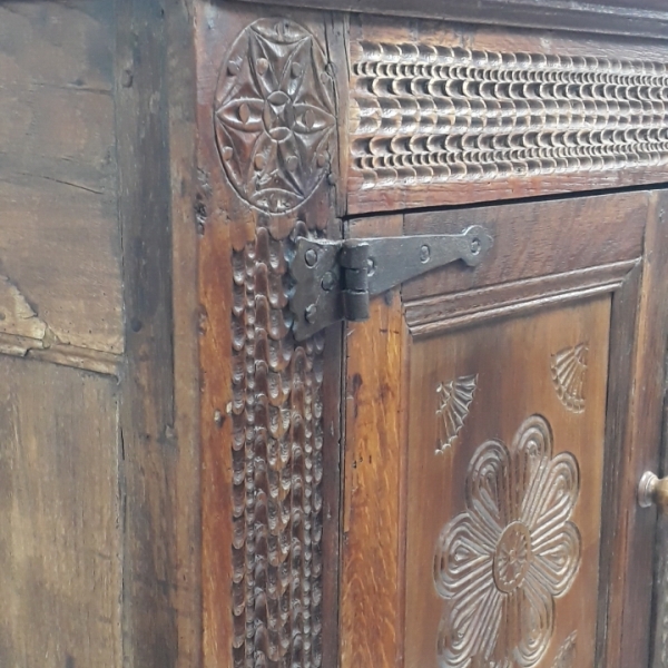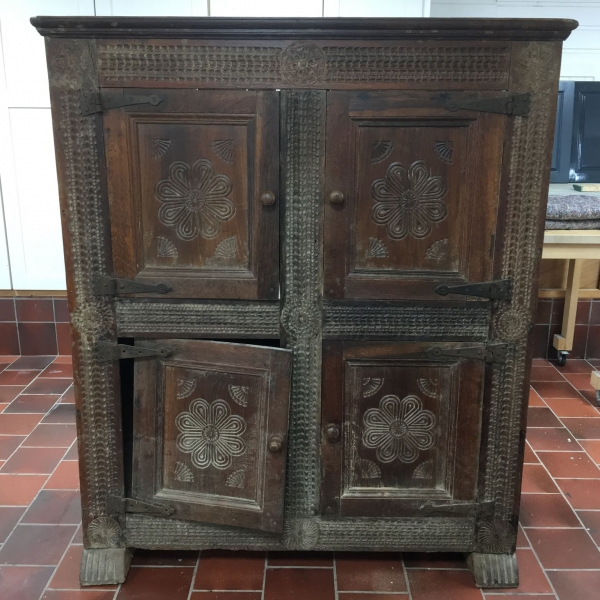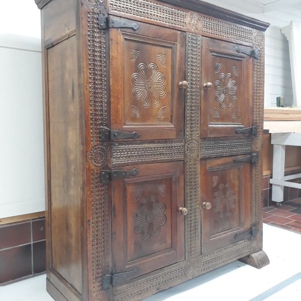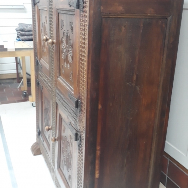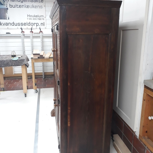 De kast is voorzien van een nieuw rechter zijpaneel, alle deuren zijn opnieuw afgehangen, schades zijn gerepareerd, heeft een houtworm behandeling gekregen en is opnieuw in de wax gezet.