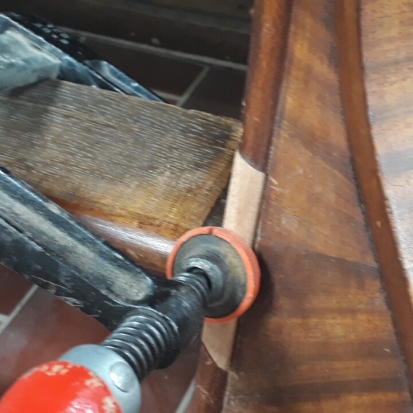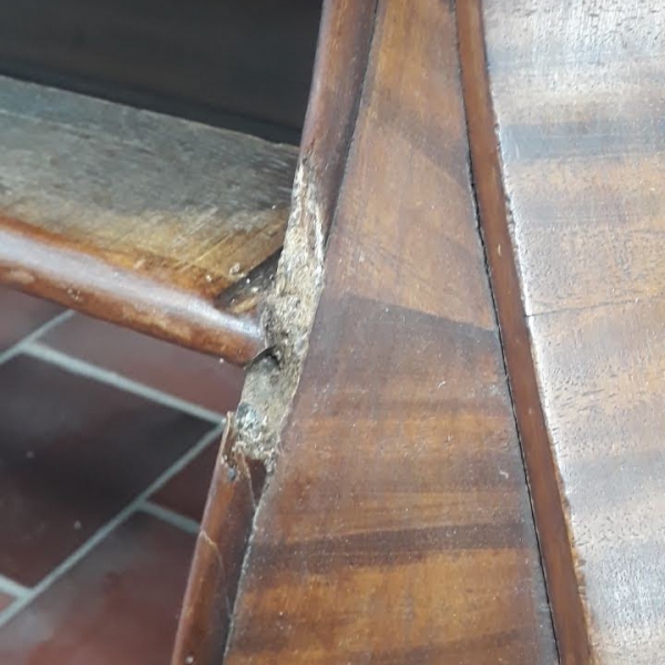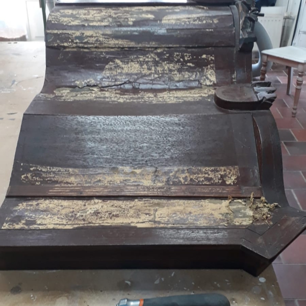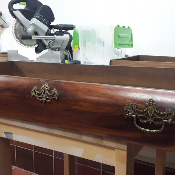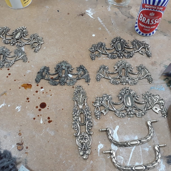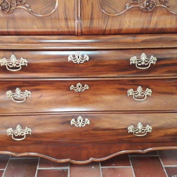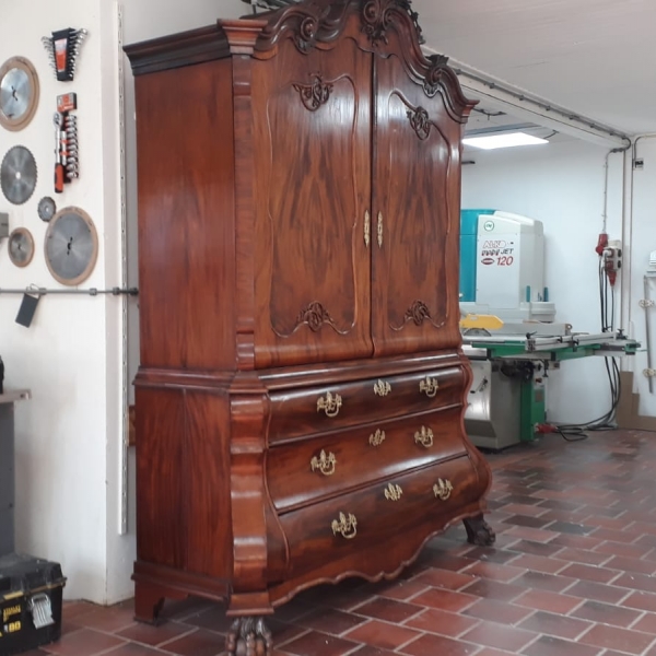 De kast is grondig schoongemaakt, alle schades zijn gerepareerd, het beslag is schoon geboend en het oppervlak is opnieuw gepolitoerd.